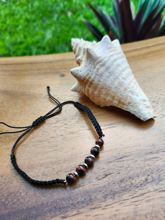Bracelet ref 54 : Cordon réglable œil de tigre marron foncé et hématite sur cordon tressé rouge