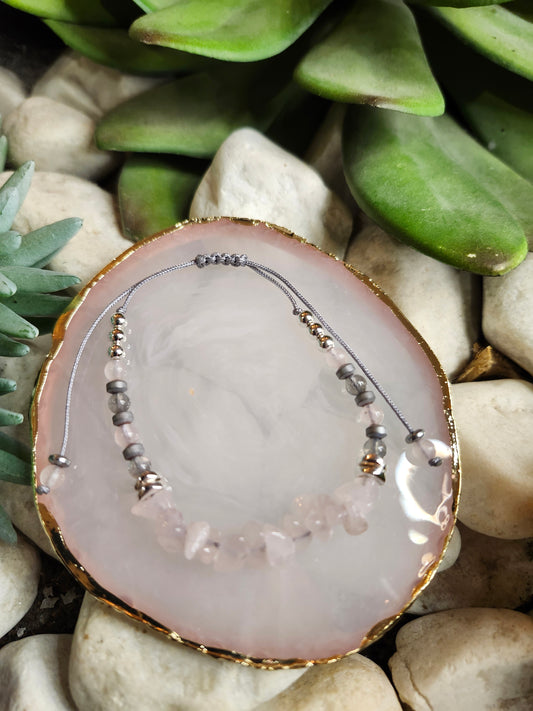Bracelet ref 92 : Cordon réglable Quartz rose, Labradorite, Hématite