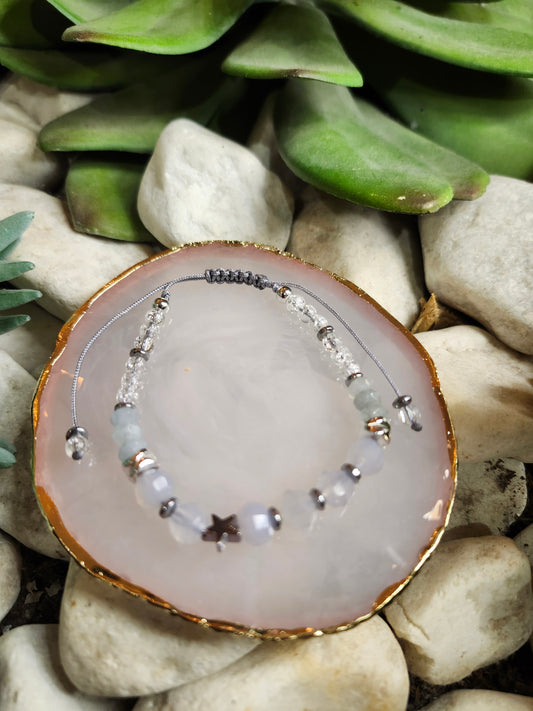 Bracelet ref 97 : Cordon réglable Calcédoine, Aqua marin, cristal de roche et Hématite