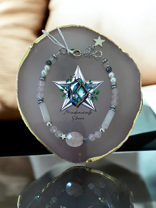 Bracelet réf. 6 : Pierres Quartz rose, Nacre et Cristal de roche