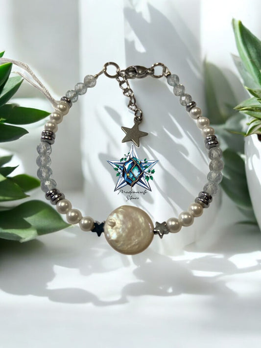 Bracelet ref 85 : Cordon réglable Pierre de lune, Apatite, Nacre et Hématite