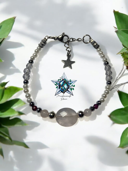 Bracelet réf. 4 : Pierres Quartz rose, œil de sainte Lucie et Hématite