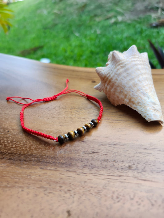 Bracelet ref 52 : Cordon réglable œil de tigre marron clair et hématite sur cordon tressé rouge