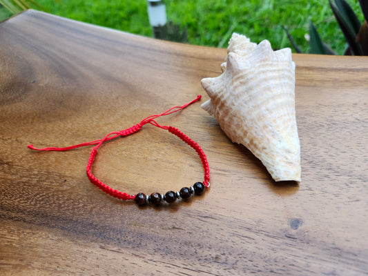Bracelet ref 54 : Cordon réglable œil de tigre marron foncé et hématite sur cordon tressé rouge