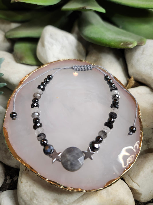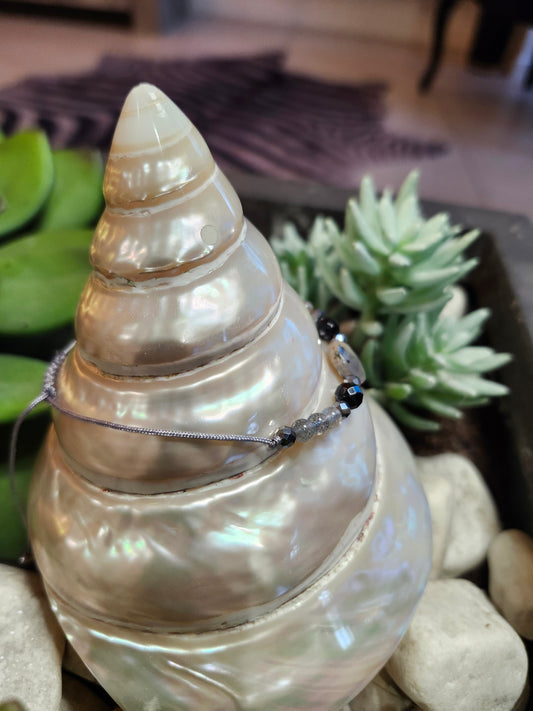 Bracelet ref 58 : Cordon réglable Labradorite, onyx et hématite