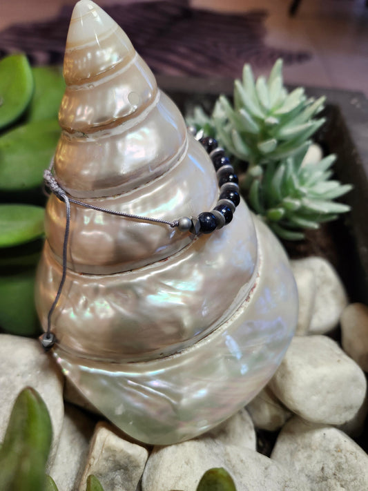 Bracelet ref 60 : Cordon réglable Œil de tigre bleu et hématite